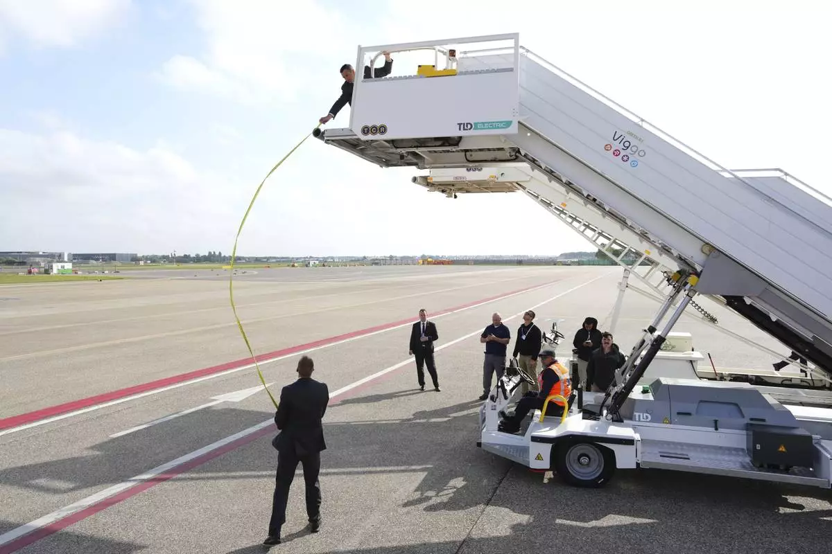 U.S. security personnel use a measuring tape to establish the required height for the boarding stairs that will be used for Air Force One ahead of President Donald Trump's arrival at Amsterdam Schiphol Airport for the NATO summit, taking place in The Hague, Netherlands, Tuesday, June 24, 2025. (AP Photo/Peter Dejong)