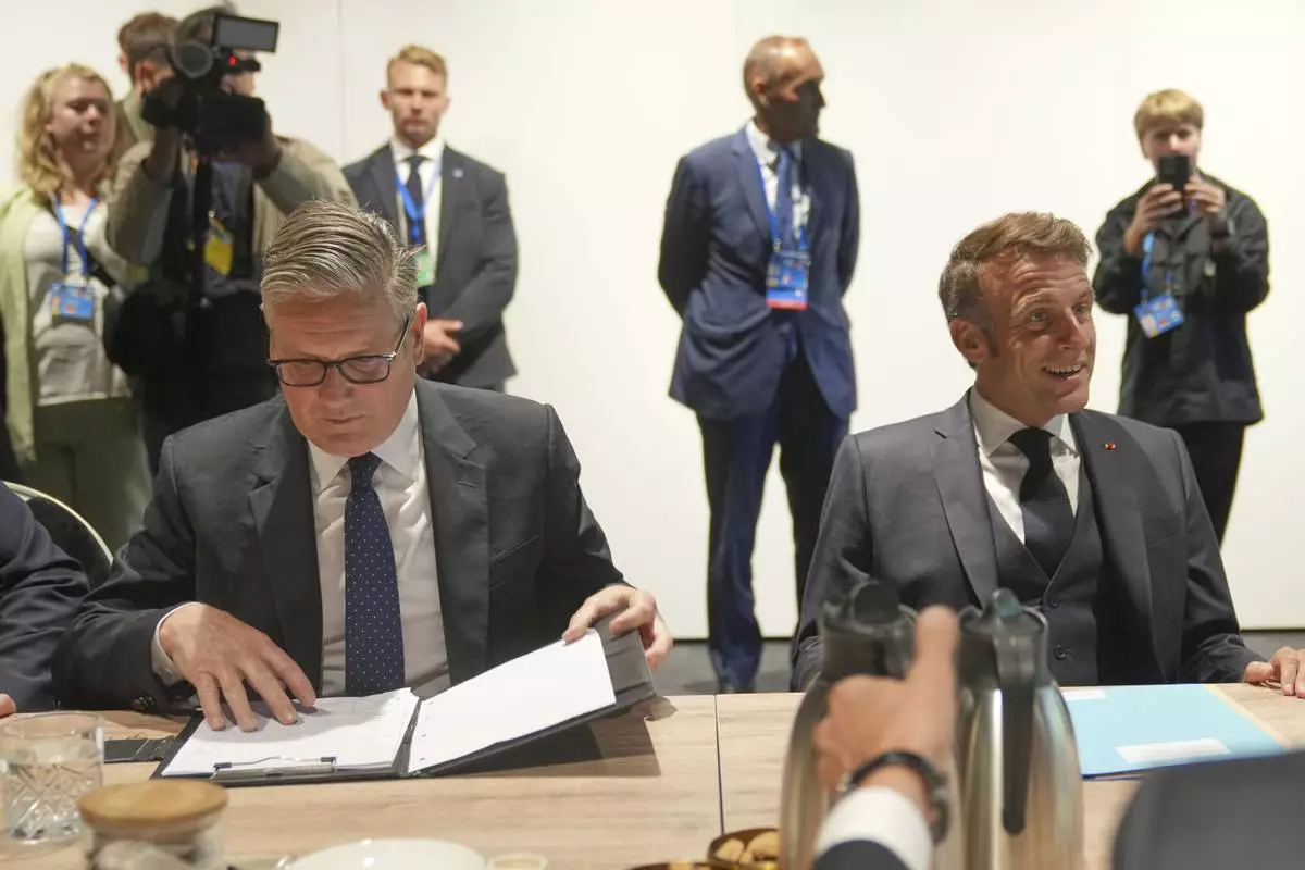 French President Emmanuel Macron, right and Britain's Prime Minister Keir Starmer take their seat at the beginning of an E3 meeting at a hotel on the sidelines of the NATO summit in The Hague, Netherlands, Tuesday, June 24, 2025. (AP Photo/Kin Cheung, Pool)