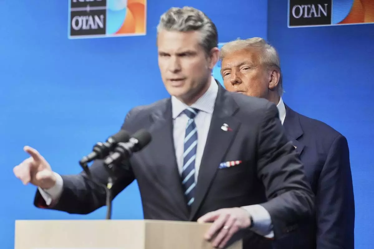 President Donald Trump watches Defense Secretary Pete Hegseth during a press conference after the plenary session at the NATO summit in The Hague, Netherlands, Wednesday, June 25, 2025. (AP Photo/Markus Schreiber)