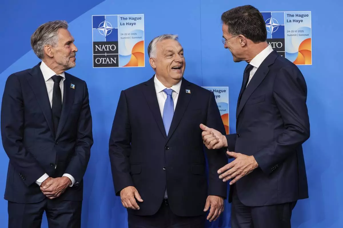 Hungary's Prime Minister Viktor Orban is greeted by NATO Secretary General Mark Rutte, right, and Netherland's Prime Minister Dick Schoof, left, at an official welcome during the NATO summit in The Hague, Netherlands, Wednesday, June 25, 2025. (AP Photo/Geert Vanden Wijngaert)