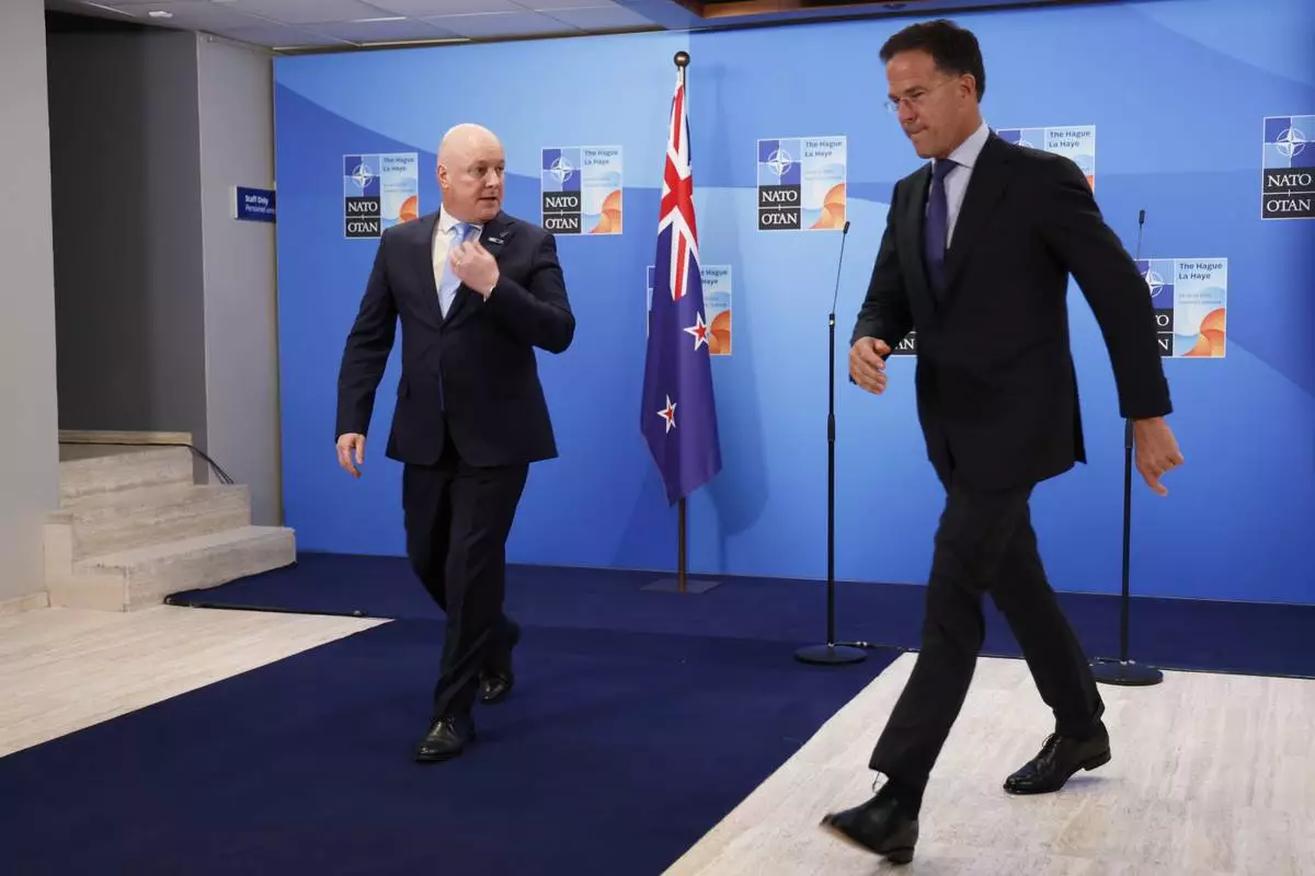 NATO Secretary General Mark Rutte, right, walks with New Zealand's Prime Minister Christopher Luxon ahead of the NATO summit in The Hague, Netherlands, Tuesday, June 24, 2025. (AP Photo/Geert Vanden Wijngaert, Pool)