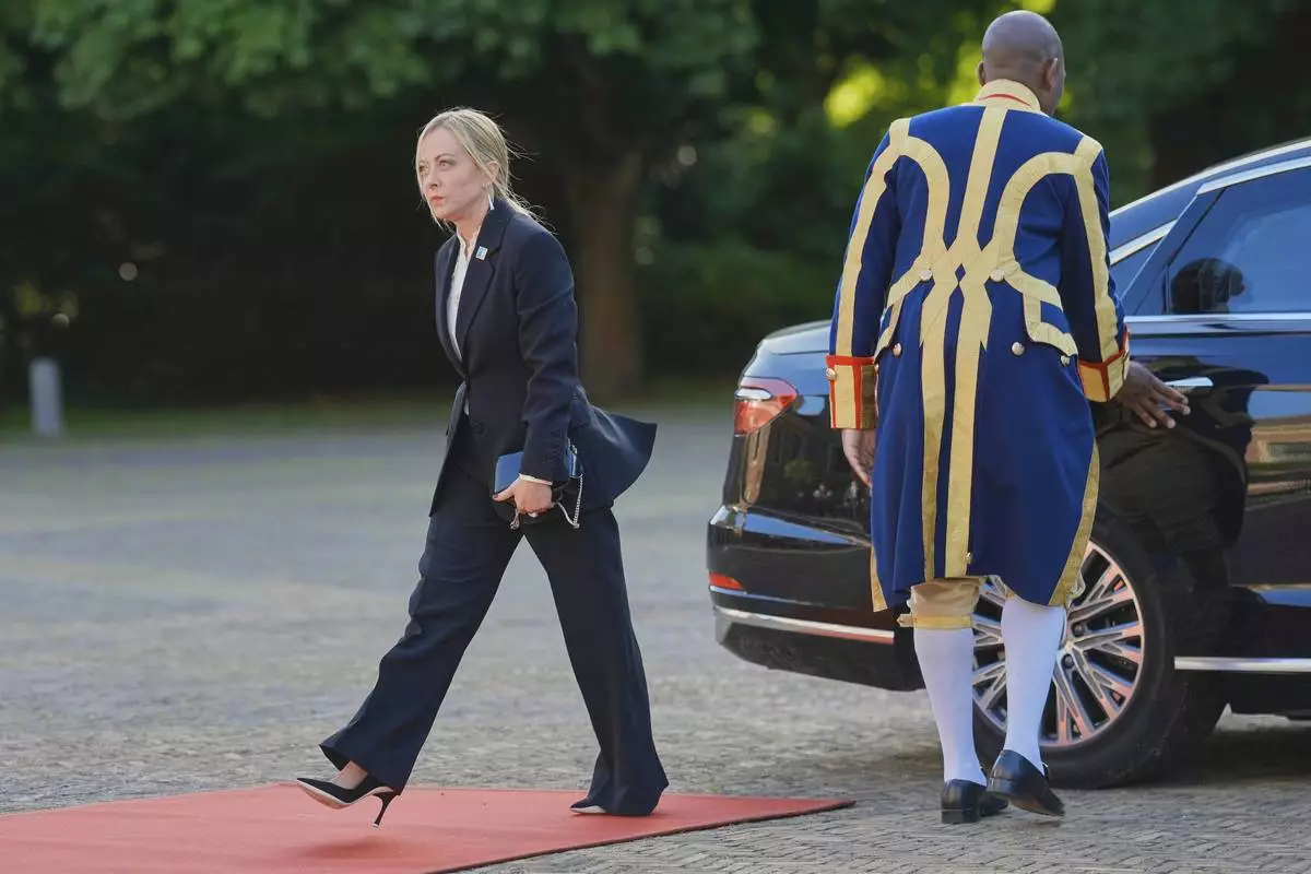 Italy's Prime Minister Giorgia Meloni arrives for a formal dinner at the Paleis Huis ten Bosch ahead of the NATO summit in The Hague, Netherlands, Tuesday, June 24, 2025. (AP Photo/Markus Schreiber)