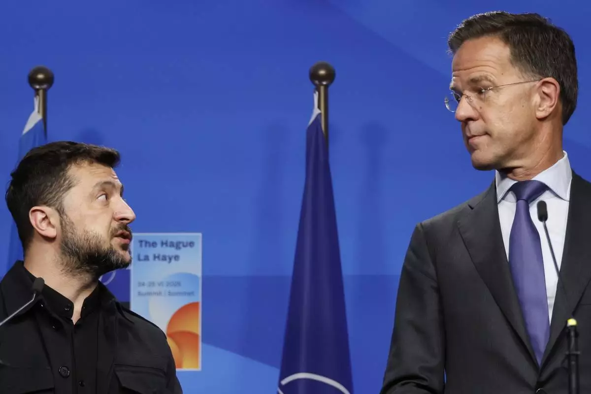 Ukraine's President Volodymyr Zelenskyy, left, speaks with NATO Secretary General Mark Rutte prior to a meeting on the sidelines of the NATO summit in The Hague, Netherlands, Tuesday, June 24, 2025. (AP Photo/Geert Vanden Wijngaert)