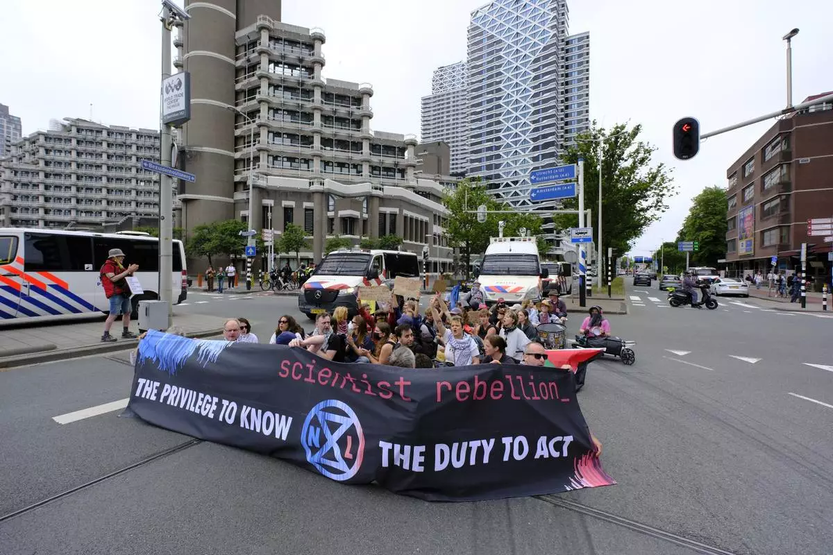 Demonstrators protest against the NATO summit as police follow them in The Hague, Netherlands, Wednesday, June 25, 2025. (AP Photo/Patrick Post)