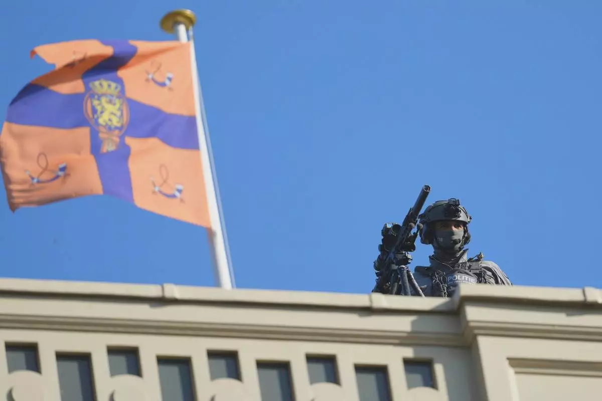 A police sharpshooter monitors the area ahead of a formal dinner at the Paleis Huis ten Bosch ahead of the NATO summit in The Hague, Netherlands, Tuesday, June 24, 2025. (AP Photo/Markus Schreiber)