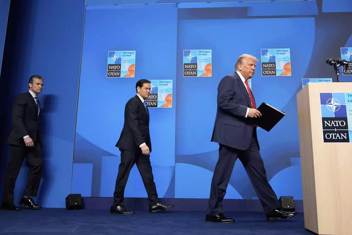 President Donald Trump, Foreign Secretary Marco Rubio, center, and Defence Secretary Pete Hegseth arrive for a media conference at the end of the NATO summit in The Hague, Netherlands, Wednesday, June 25, 2025. (AP Photo/Alex Brandon)