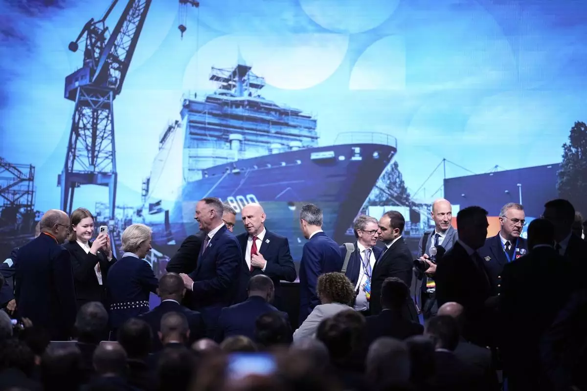 European Commission President Ursula von der Leyen, third left, and Britain's Defense Secretary John Healey, center, arrive for the NATO defense forum on the sidelines of the NATO summit in The Hague, Netherlands, Tuesday, June 24, 2025. (AP Photo/Matthias Schrader)