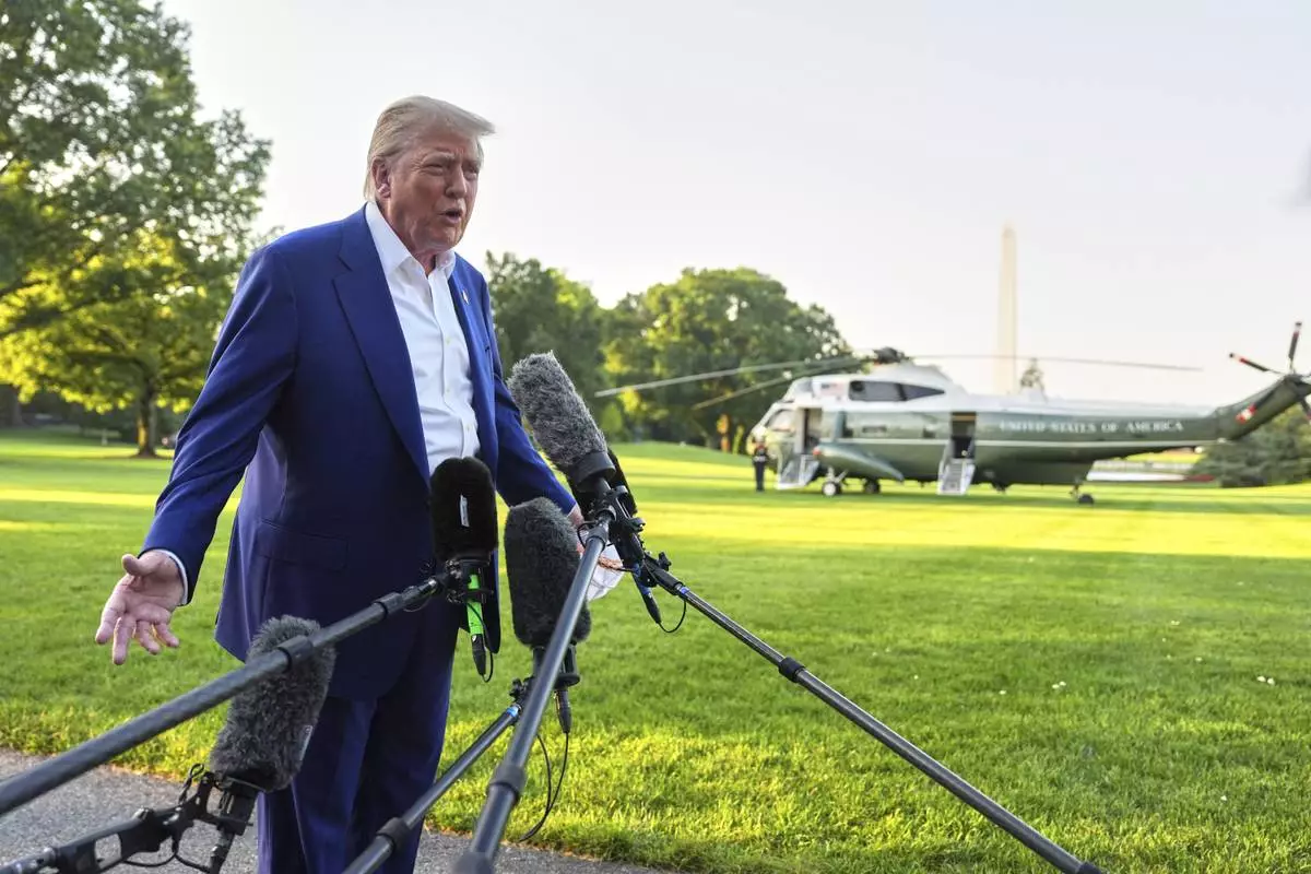 President Donald Trump speaks with reporters before boarding Marine One on the South Lawn of the White House, Tuesday, June 24, 2025, on his way to The Hague, to join world leaders gathering in the Netherlands for a two-day NATO summit. The Washington Monument stands right. (AP Photo/Evan Vucci)