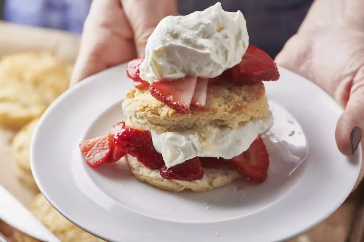 10. Just before serving, cut each biscuit crosswise. Place the bottom halves on plates, layer on some strawberries, then some whipped cream. Replace the top of the shortcake, then spoon over some more strawberries and whipped cream. Serve immediately.