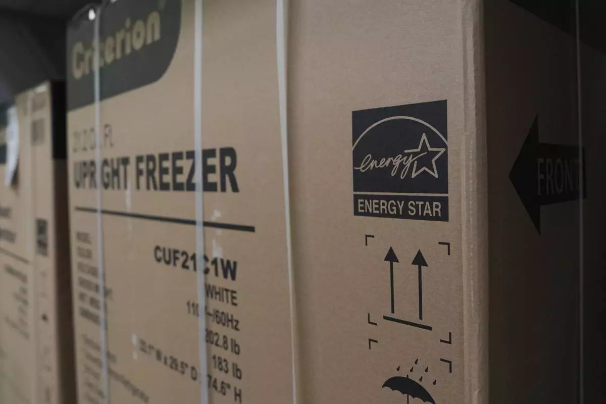 FILE - An Energy Star logo is displayed on a box for a freezer Jan. 21, 2025, in Evendale, Ohio. (AP Photo/Joshua A. Bickel, File)