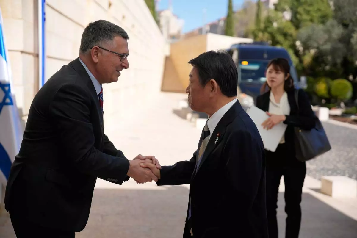 Israel's Foreign Minister Gideon Sa'ar, left, meets with Japan's Foreign Minister Toshimitsu Motegi in Jerusalem, Sunday, Jan. 11, 2026. (AP Photo/Ohad Zwigenberg)