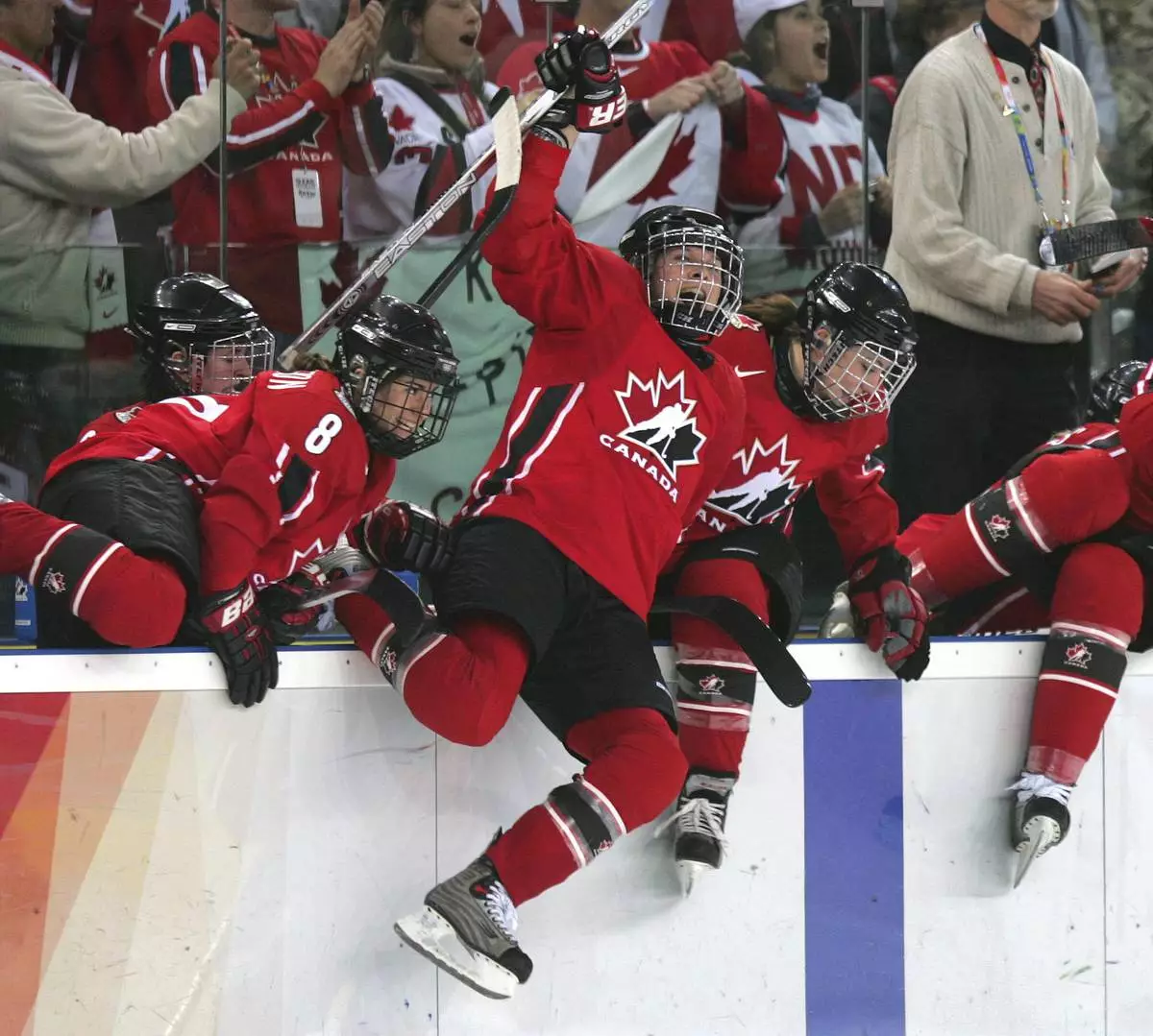 FILE - Team Canada's Jennifer Botterill, center, and other team members leap from the bench to celebrate defeating Sweden 4-1 in the women's ice hockey gold medal match at the 2006 Turin Winter Olympic Games in Turin, Italy on Feb. 20, 2006. (AP Photo/Julie Jacobson, File)