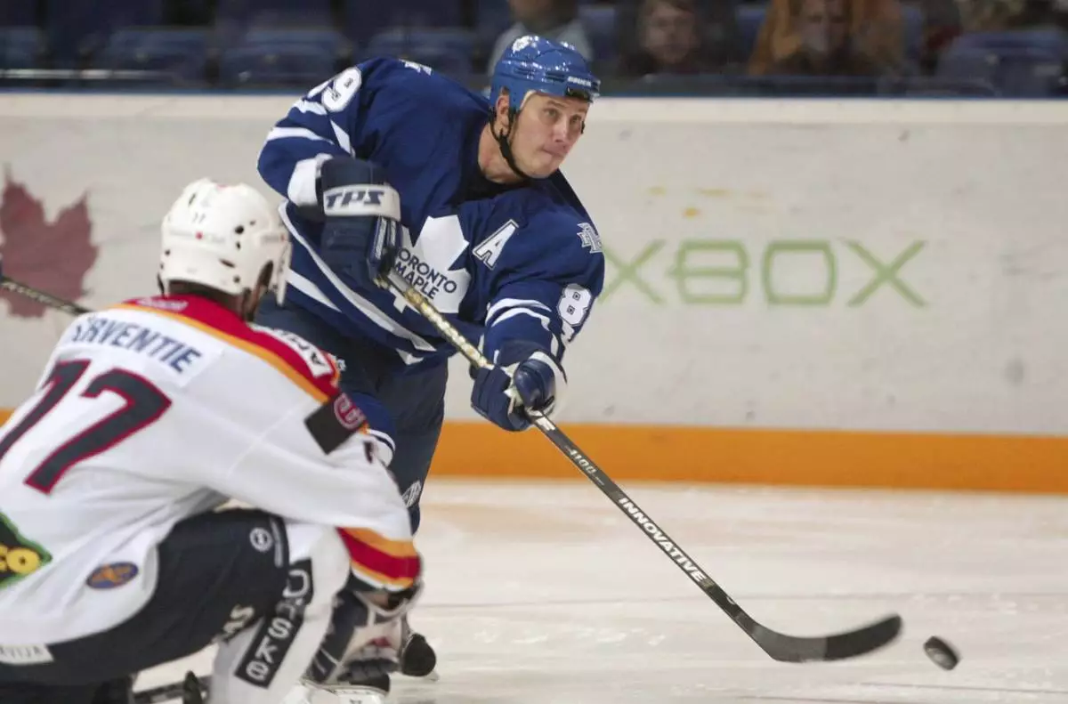 FILE - Finnish hockey team Jokerit's Martti Jarventie, left, and Toronto Maple Leaf's Alexander Mogilny compete for the puck during their friendly ice hockey match played in Helsinki, Finland, Sept. 16, 2003. (Tor Wennstrom/Lehtikuva via AP, File)