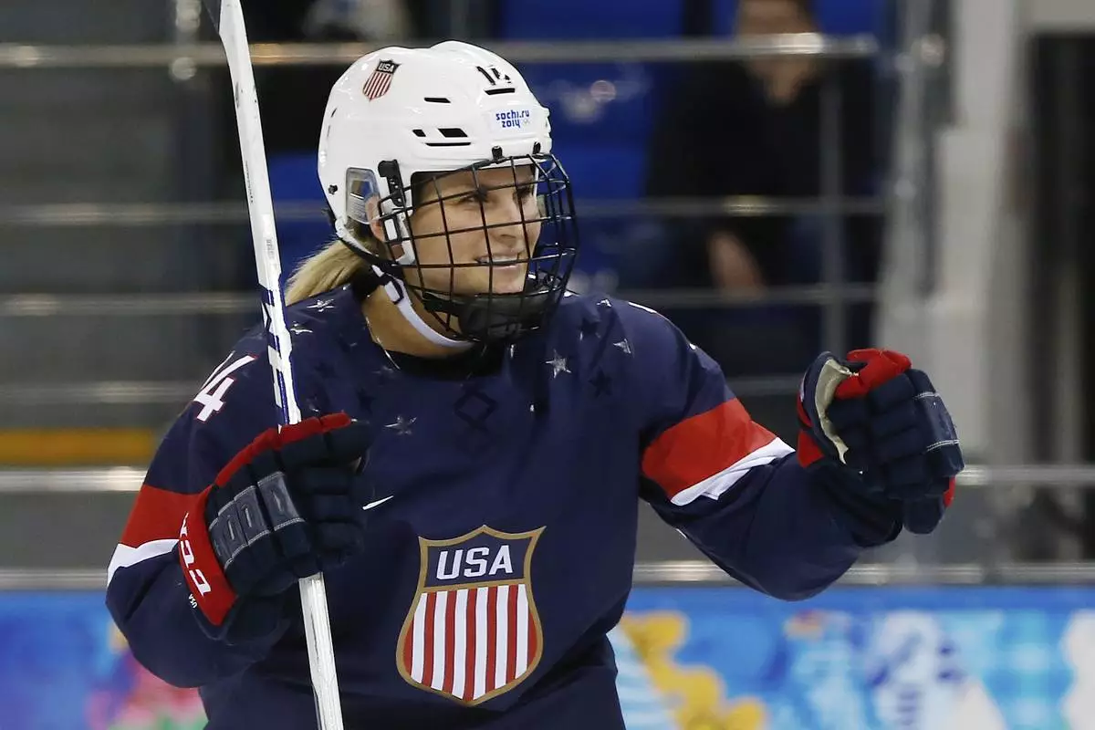 FILE - Brianna Decker of the United States celebrates her goal against Sweden during the third period of the 2014 Winter Olympics women's semifinal ice hockey game at Shayba Arena, Feb. 17, 2014, in Sochi, Russia. (AP Photo/Petr David Josek, File)