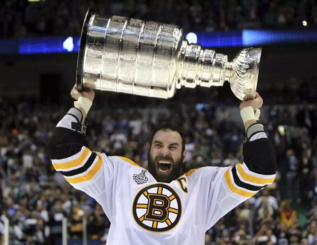 FILE - Boston Bruins' Zdeno Chara, of Slovakia, hoists the cup following the Bruins' 4-0 win over the Vancouver Canucks in Game 7 of the NHL hockey Stanley Cup Finals on June 15, 2011, in Vancouver, British Columbia, Canada. (Jonathan Hayward/The Canadian Press via AP)