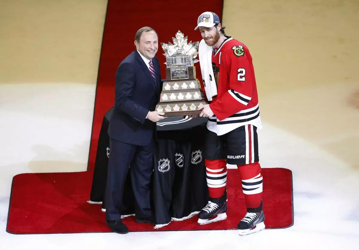 FILE - Chicago Blackhawks' Duncan Keith, right, is awarded the The Conn Smythe Trophy by commissioner Gary Bettman after the Blackhawks 2-0 victory over the Tampa Bay Lightning in Game 6 of the NHL hockey Stanley Cup Final series on June 15, 2015, in Chicago. (AP Photo/Charles Rex Arbogast, File)