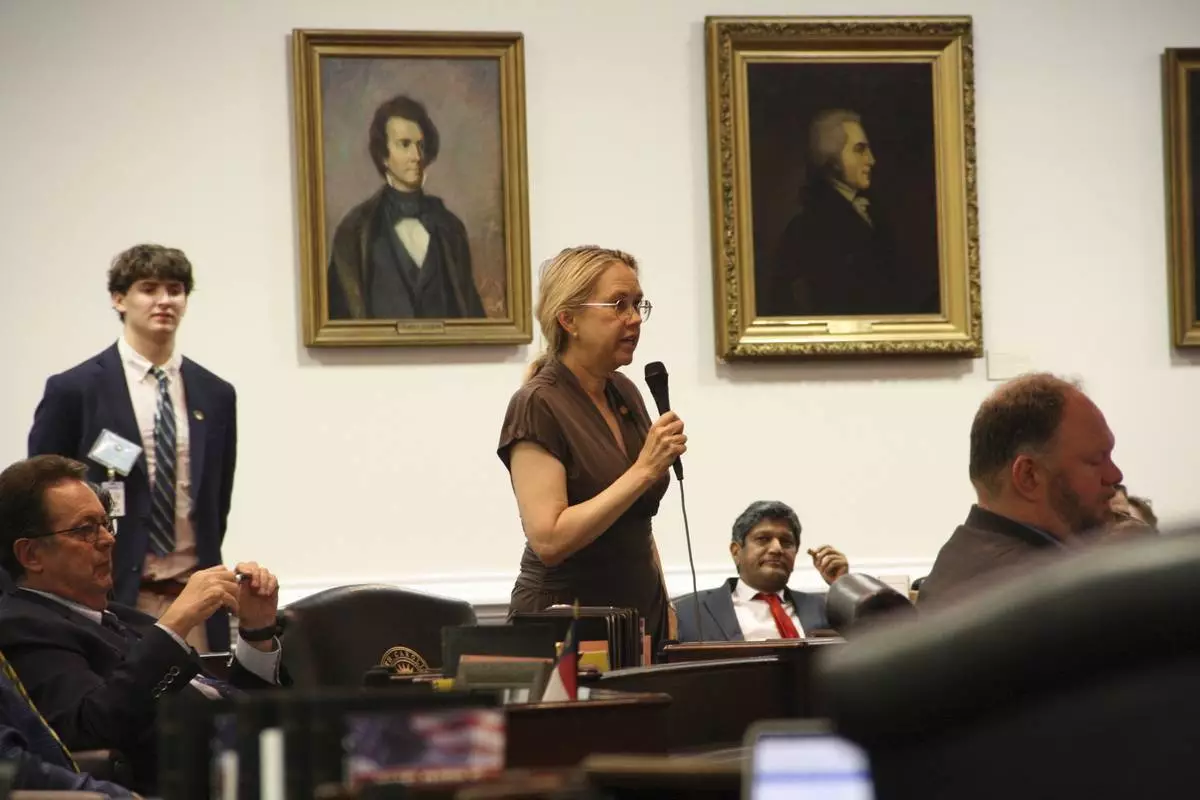 Sen. Amy Galey speaks in favor of a bill that would shield parents from certain abuse and neglect charges for raising their transgender child in accordance with their sex assigned at birth on the North Carolina Senate floor in Raleigh, N.C., on Monday, June 23, 2025. (AP Photo/Makiya Seminera)