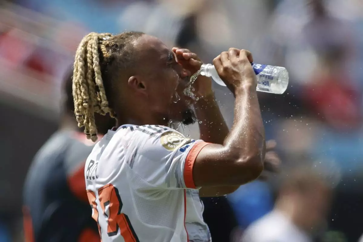 Bayern Munich's Sacha Boey poors water on his face during the Club World Cup Group C soccer match between Benfica and Bayern Munich in Charlotte, N.C., Tuesday, June 24, 2025. (AP Photo/Nell Redmond)