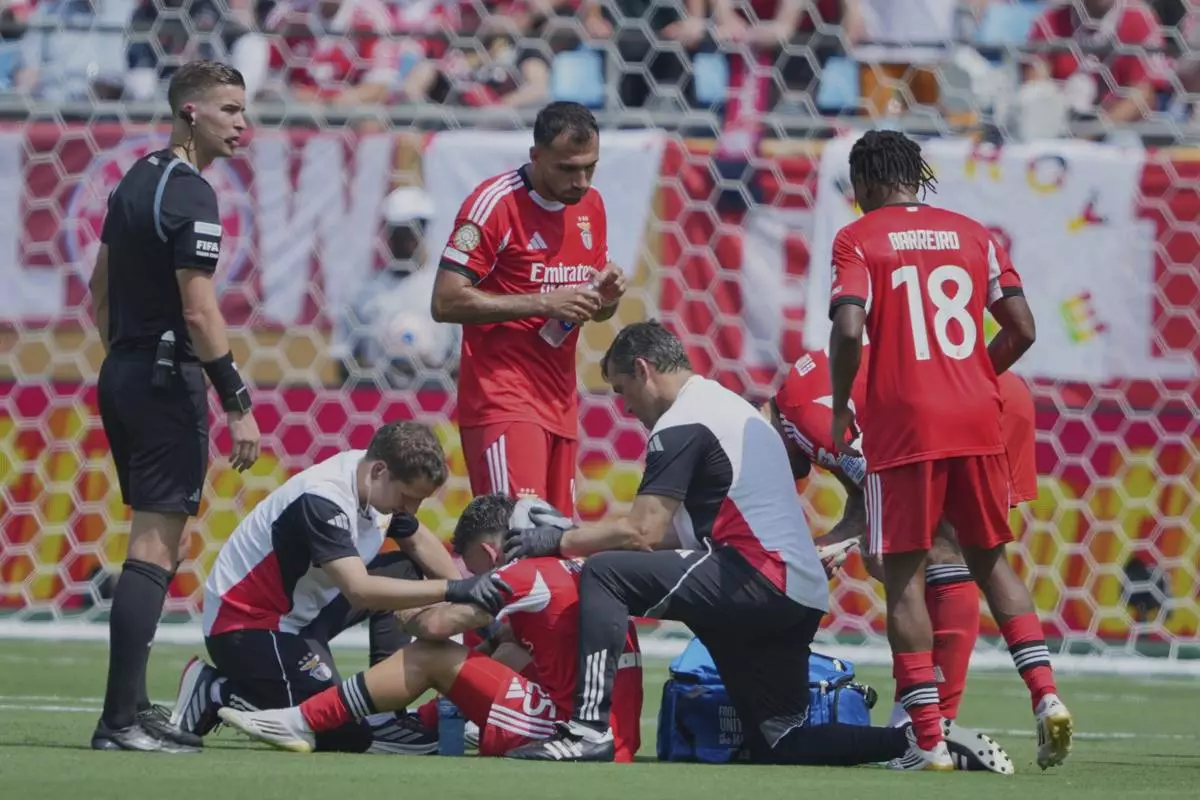 Benfica's Gianluca Prestianni is attended to during the Club World Cup Group C soccer match between Benfica and Bayern Munich in Charlotte, N.C., Tuesday, June 24, 2025. (AP Photo/Chris Carlson)