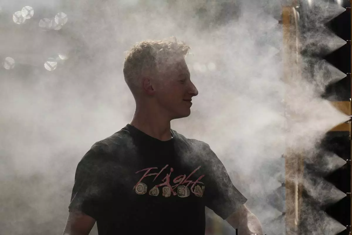 Nolan Kelehel cools off in a mister at Kauffman Stadium before a baseball game between the Kansas City Royals and the Tampa Bay Rays, Wednesday, June 25, 2025, in Kansas City, Mo. (AP Photo/Charlie Riedel)