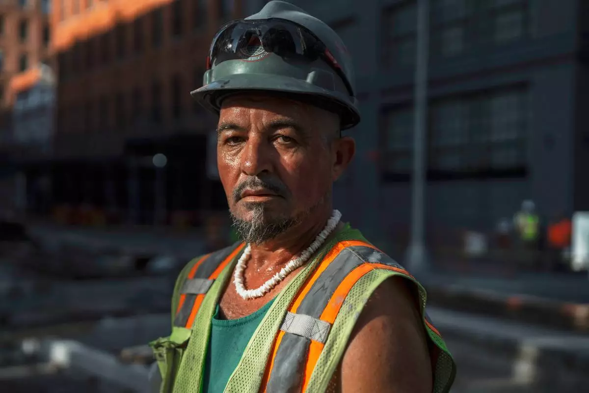 Construction worker Tony Martins, 49, sweats as he stands for a portrait during a heatwave on Tuesday, June 24, 2025, in New York. (AP Photo/Olga Fedorova)