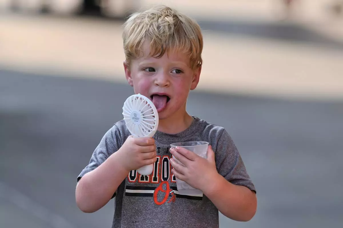 Asher Gillen, 3, uses a battery-powered fan while holding a cup of ice to cool off during hot weather before a baseball game between the Baltimore Orioles and the Texas Rangers, Monday, June 23, 2025, in Baltimore. (AP Photo/Stephanie Scarbrough)