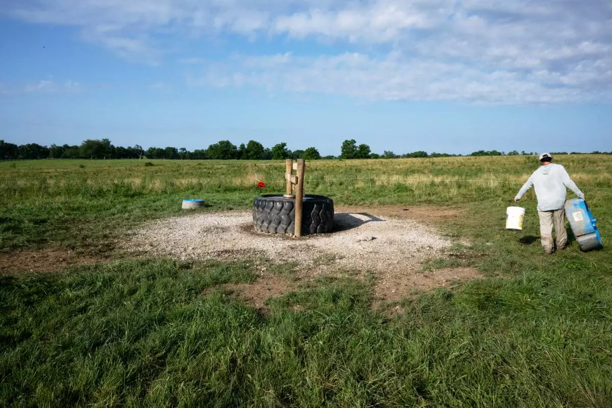 Bobby Carey fills mineral feeders for his herd of cattle at Oakland Farm, Monday, June 23, 2025, in Bourbon County, Ky. (AP Photo/Michael Swensen)
