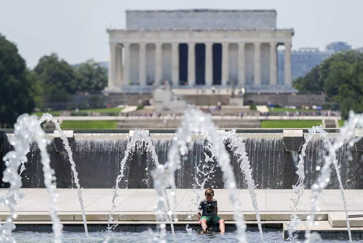 A boy cools off at the World War II Memorial, Tuesday, June 24, 2025, in Washington. (AP Photo/Julia Demaree Nikhinson)