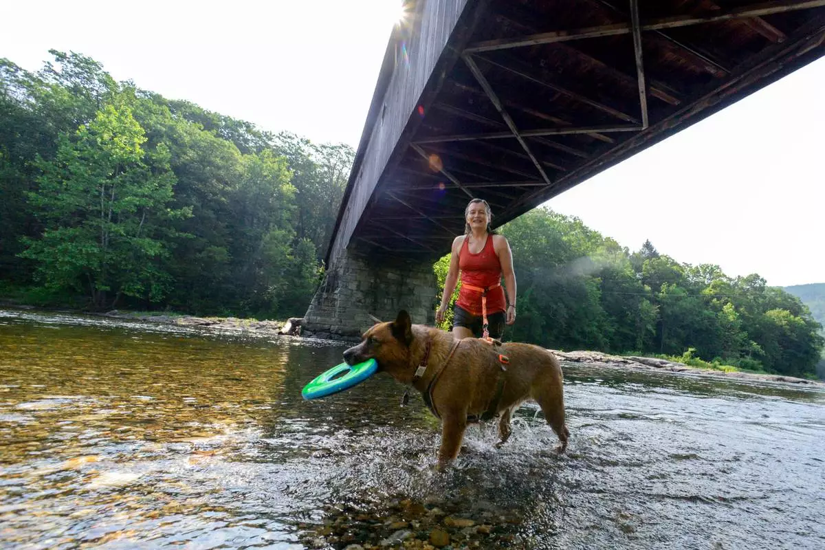 Lucy Stamp and her dog, Kenna, cool down under the Dummerston Covered Bridge in the West River, Monday, June 23, 2025, in Dummerston, Vt. (Kristopher Radder/The Brattleboro Reformer via AP)