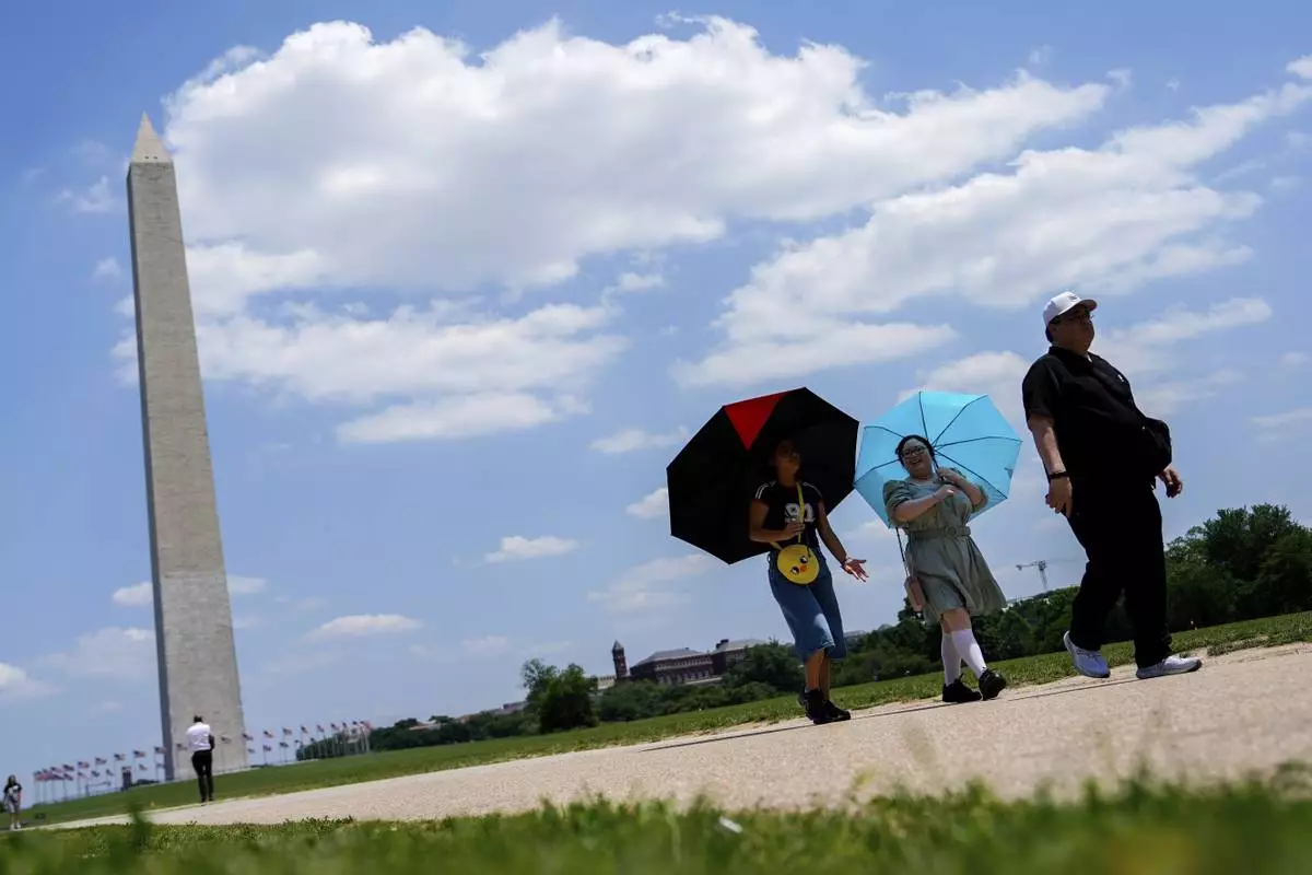People use umbrellas to shield themselves from the sun as they walk along the National Mall, Tuesday, June 24, 2025, in Washington, past the Washington Monument. (AP Photo/Julia Demaree Nikhinson)
