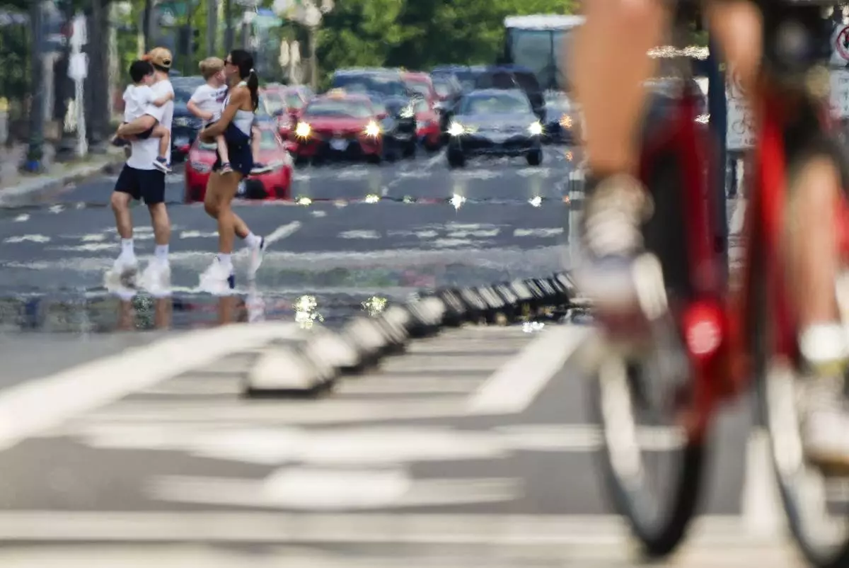 People cross Pennsylvania Avenue as heat rises from the crosswalk and street, Wednesday, June 25, 2025, in Washington. (AP Photo/Julia Demaree Nikhinson)