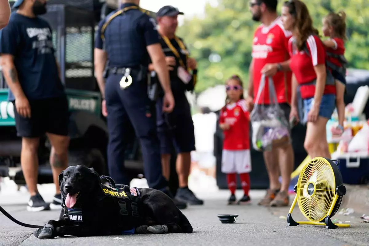 Dory, an explosive certified dog, cools down in front of a fan outside of Bank of America Stadium before the start of a FIFA Club World Cup game, Tuesday, June 24, 2025, in Charlotte, N.C. (AP Photo/Erik Verduzco)