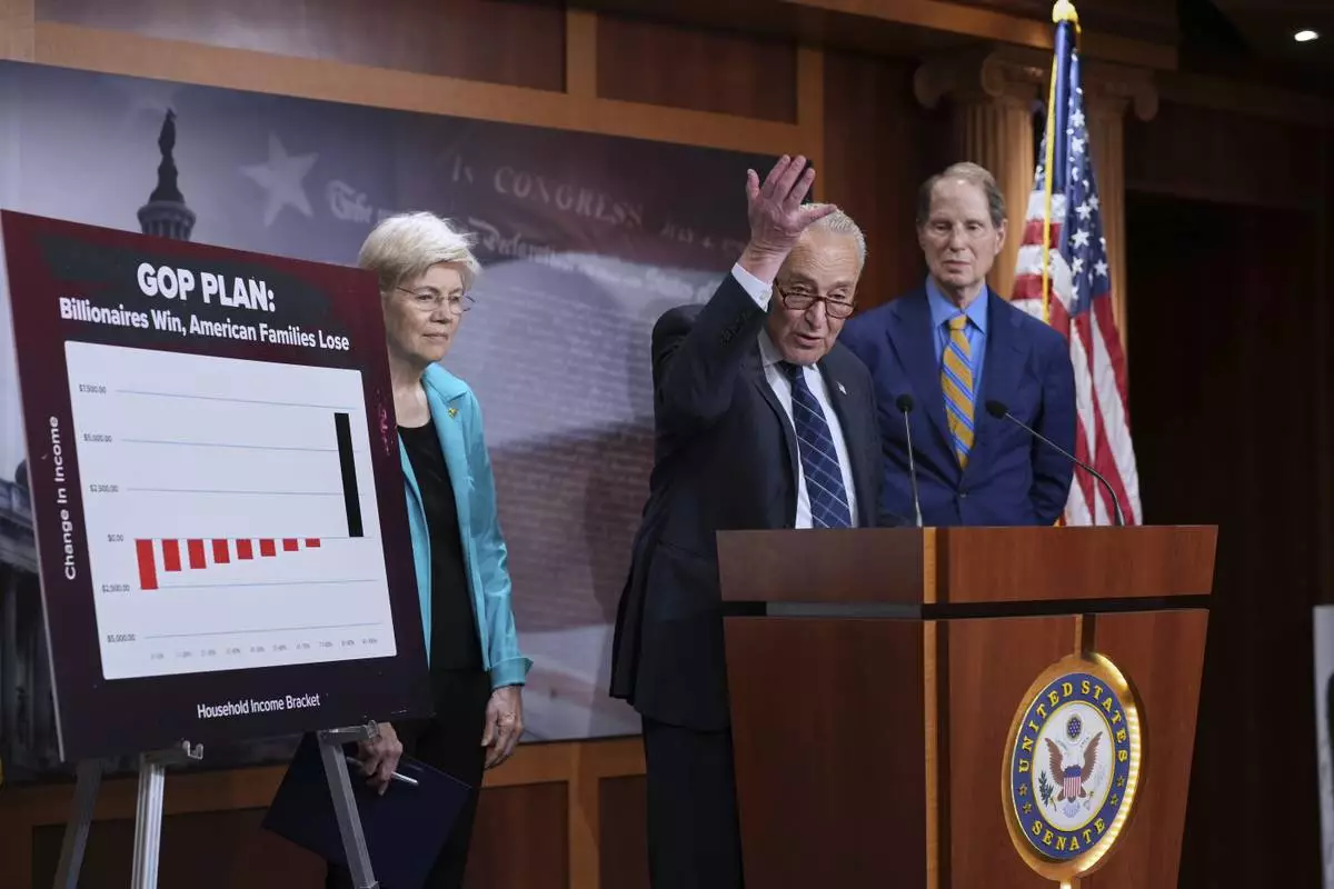Senate Minority Leader Chuck Schumer, D-N.Y., is joined by Sen. Elizabeth Warren, D-Mass., left, ranking member of the Senate Banking, Housing, and Urban Affairs Committee, and Sen. Ron Wyden, D-Ore., the ranking member of the Senate Finance Committee, as he talks to reporters about Senate Republicans' efforts to pass President Donald Trump's tax cut and spending agenda with deeper Medicaid cuts, at the Capitol in Washington, Wednesday, June 18, 2025. (AP Photo/J. Scott Applewhite)