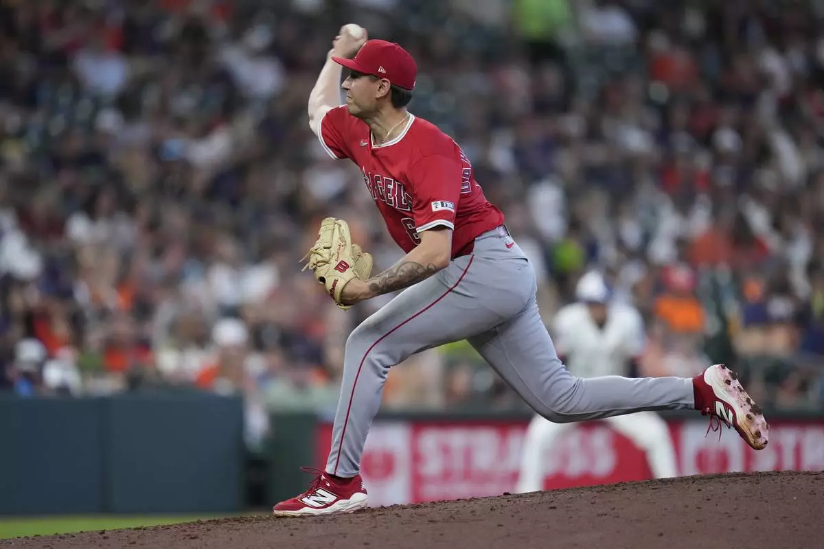 FILE - Los Angeles Angels pitcher Michael Darrell-Hicks (61) pitches during the seventh inning of a baseball game against the Houston Astros, April 13, 2025, in Houston. (AP Photo/Kevin M. Cox, File)