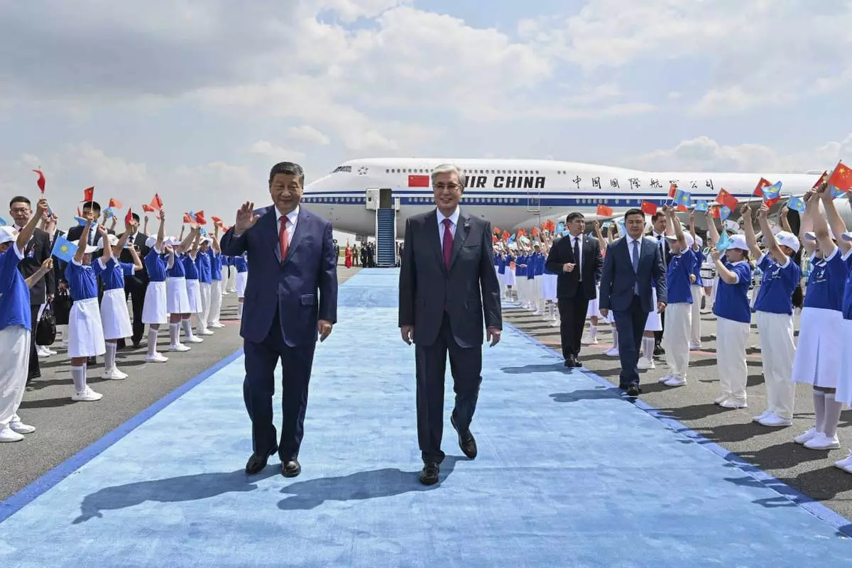 In this photo released by Kazakhstan's Presidential Press Office, Chinese President Xi Jinping, left, walks with Kazakh President Kassym-Jomart Tokayev upon his arrival at an international airport outside Astana, Kazakhstan, on Monday, June 16, 2025. (Kazakhstan's Presidential Press Office via AP)