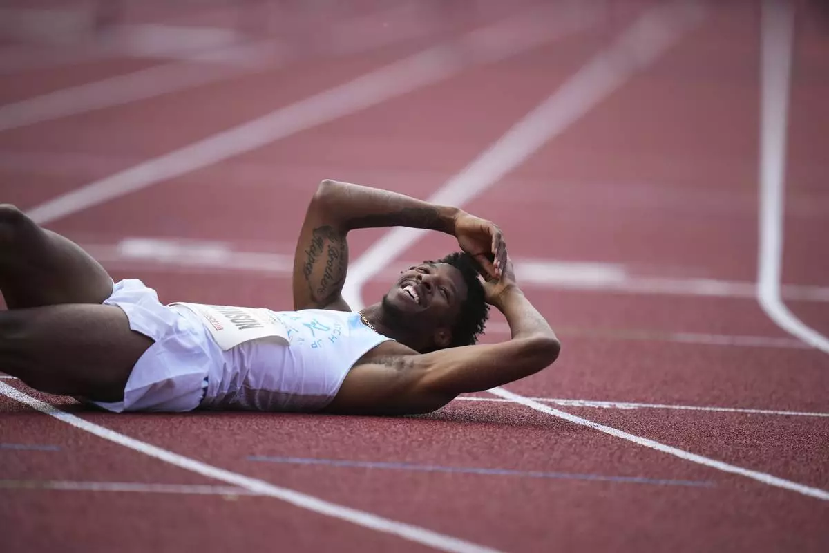 Chris Robinson, of the United States, reacts after falling past the finish line to win the men 400 meters hurdles during the Ostrava Golden Spike athletics meet in Ostrava, Czech Republic, Tuesday, June 24, 2025. (AP Photo/Petr David Josek)