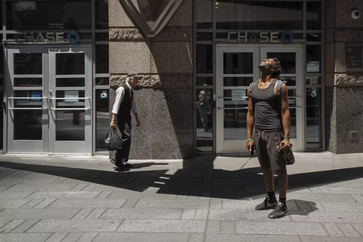 A man squints at the sun during a heatwave on Tuesday, June 24, 2025, in New York. (AP Photo/Olga Fedorova)