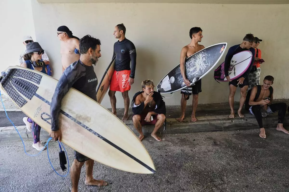 Surfers take shelter as air raid sirens warn of incoming Iranian strikes in Haifa beachfront, Israel, Tuesday, June 24, 2025, shortly after Israel and Iran accepted a ceasefire plan proposed by President Donald Trump. (AP Photo/Baz Ratner)