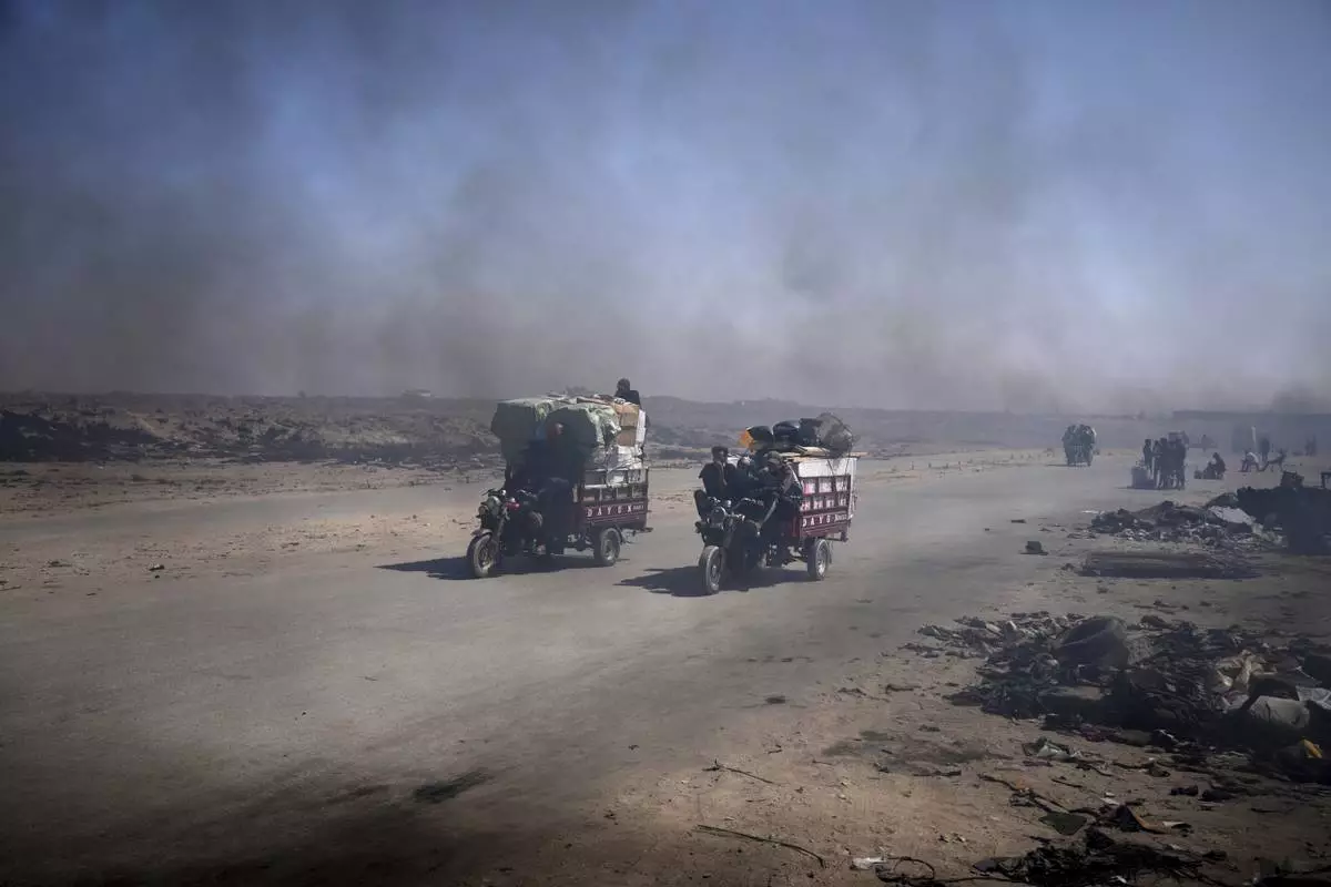 Residents ride through black smoke coming from makeshift burners used to extract fuel from melted plastic, along the Sea Road, south of Gaza City, Sunday, June 22, 2025. (AP Photo/Abdel Kareem Hana)