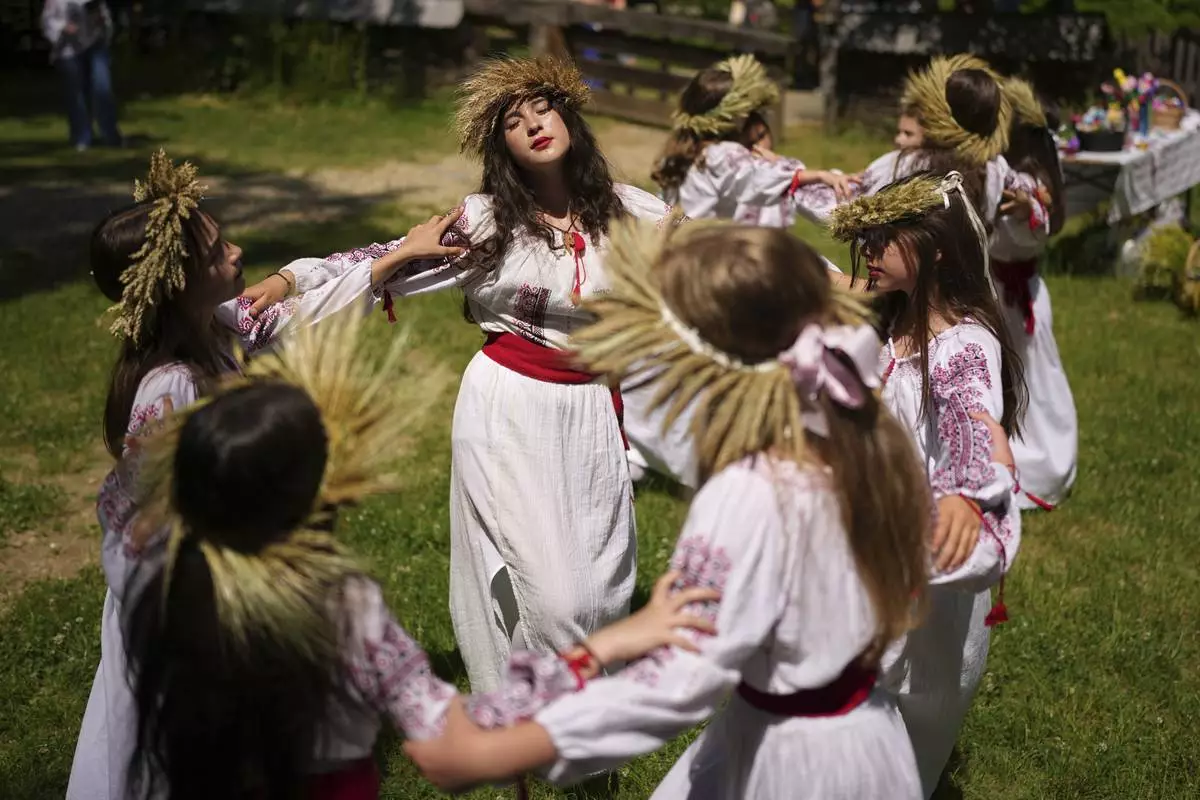 Girls wearing crowns made of flowers dance during an event inspired by pre-Christian traditions, in which fairies, called in Romanian "Sanziene," come to earth around the summer solstice bringing fertility to land and beings, at the Dimitrie Gusti Village Museum in Bucharest, Romania, Tuesday, June 24, 2025. (AP Photo/Andreea Alexandru)