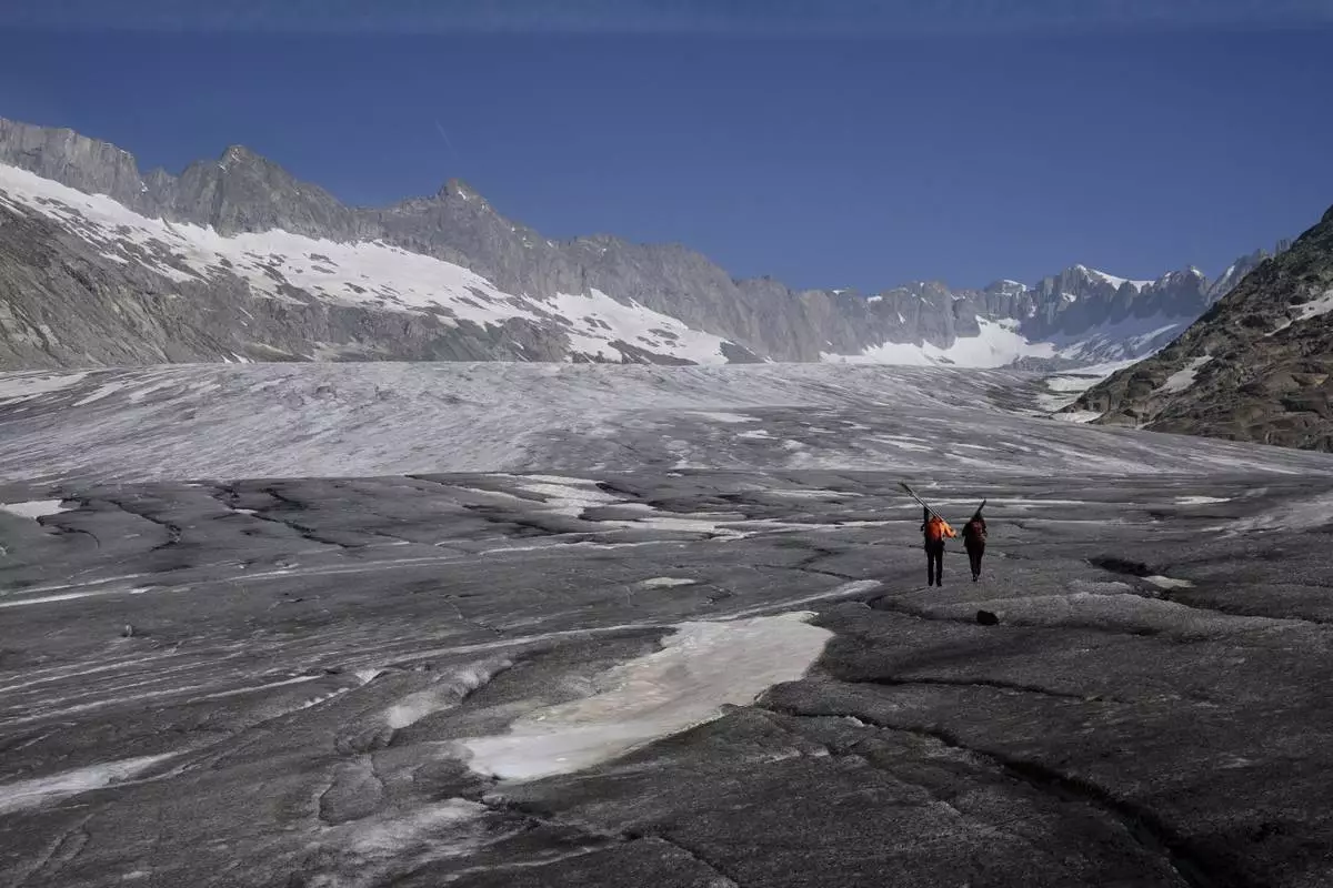 Matthias Huss, of the Federal Institute of Technology in Zurich and glacier monitoring group GLAMOS, and Monica Ursina Jaeger arrive at the Rhone glacier near Goms, Switzerland, June 10, 2025. (AP Photo/Matthias Schrader)
