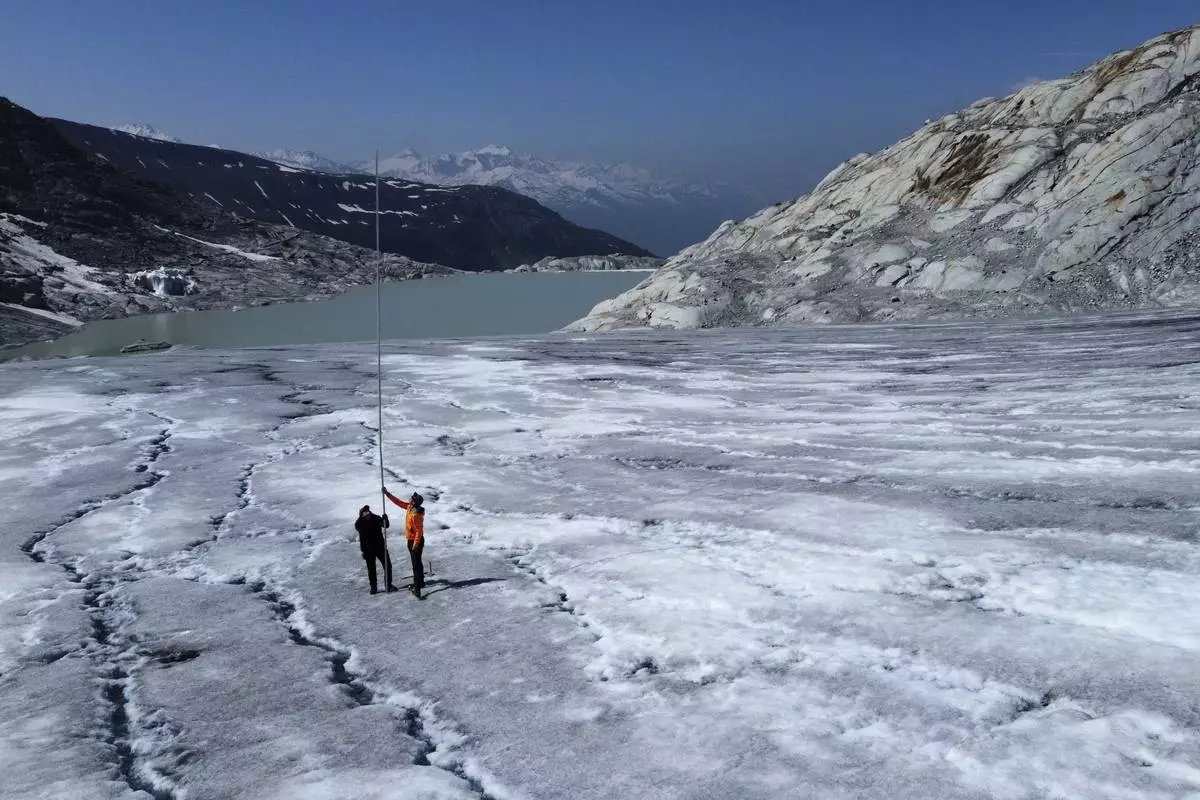 “We have a network of stakes that are drilled into the ice where we determine the melting of the mass loss of the glacier from year to year,” he said. “When the glacier will be melting, which is at the moment a speed of about 5 to 10 centimeters (2-4 inches) a day, this pole will re-emerge.”