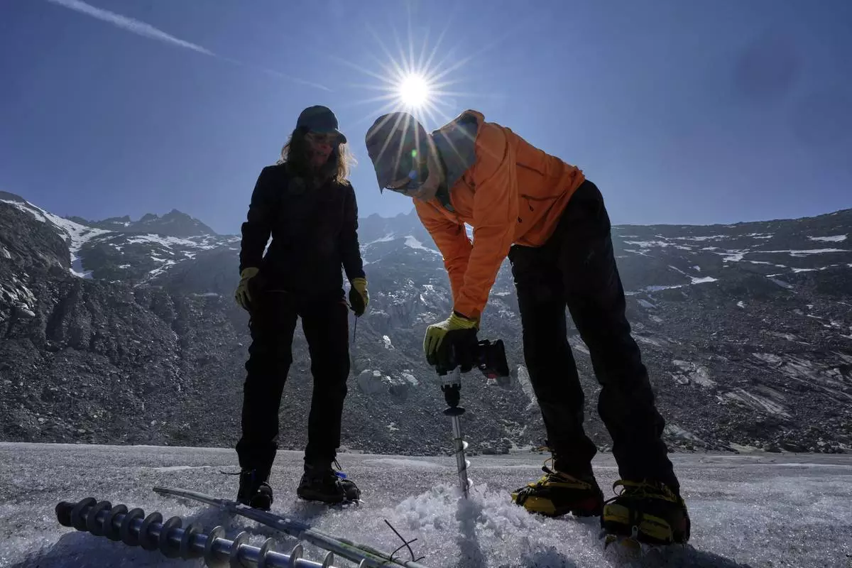 Matthias Huss, of the Federal Institute of Technology in Zurich and glacier monitoring group GLAMOS, and Monica Ursina Jaeger make measurements at the Rhone glacier near Goms, Switzerland, June 10, 2025. (AP Photo/Matthias Schrader)