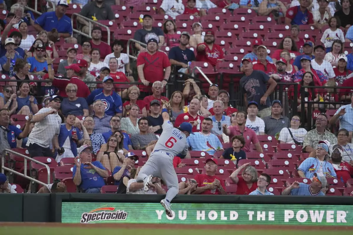 Chicago Cubs third baseman Matt Shaw is unable to catch a foul ball by St. Louis Cardinals' Nolan Gorman during the fourth inning of a baseball game Tuesday, June 24, 2025, in St. Louis. (AP Photo/Jeff Roberson)