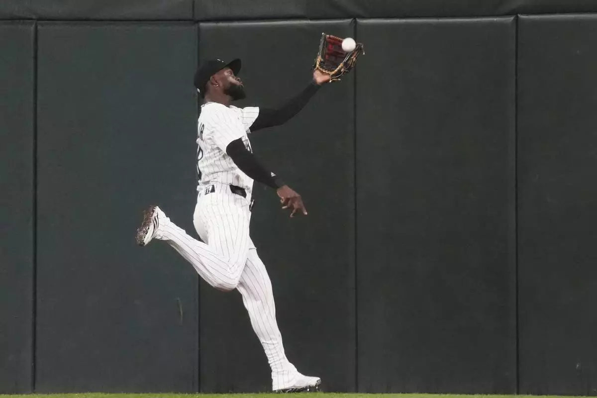 Chicago White Sox center fielder Luis Robert Jr. catches a fly ball hit by Arizona Diamondbacks' Jose Herrera during the seventh inning of a baseball game in Chicago, Tuesday, June 24, 2025. (AP Photo/Nam Y. Huh)