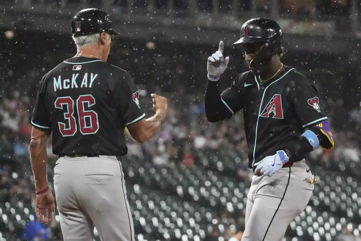Arizona Diamondbacks' Geraldo Perdomo, right, celebrates with first base coach Dave McKay after hitting a one-run single during the seventh inning of a baseball game against the Chicago White Sox in Chicago, Tuesday, June 24, 2025. (AP Photo/Nam Y. Huh)