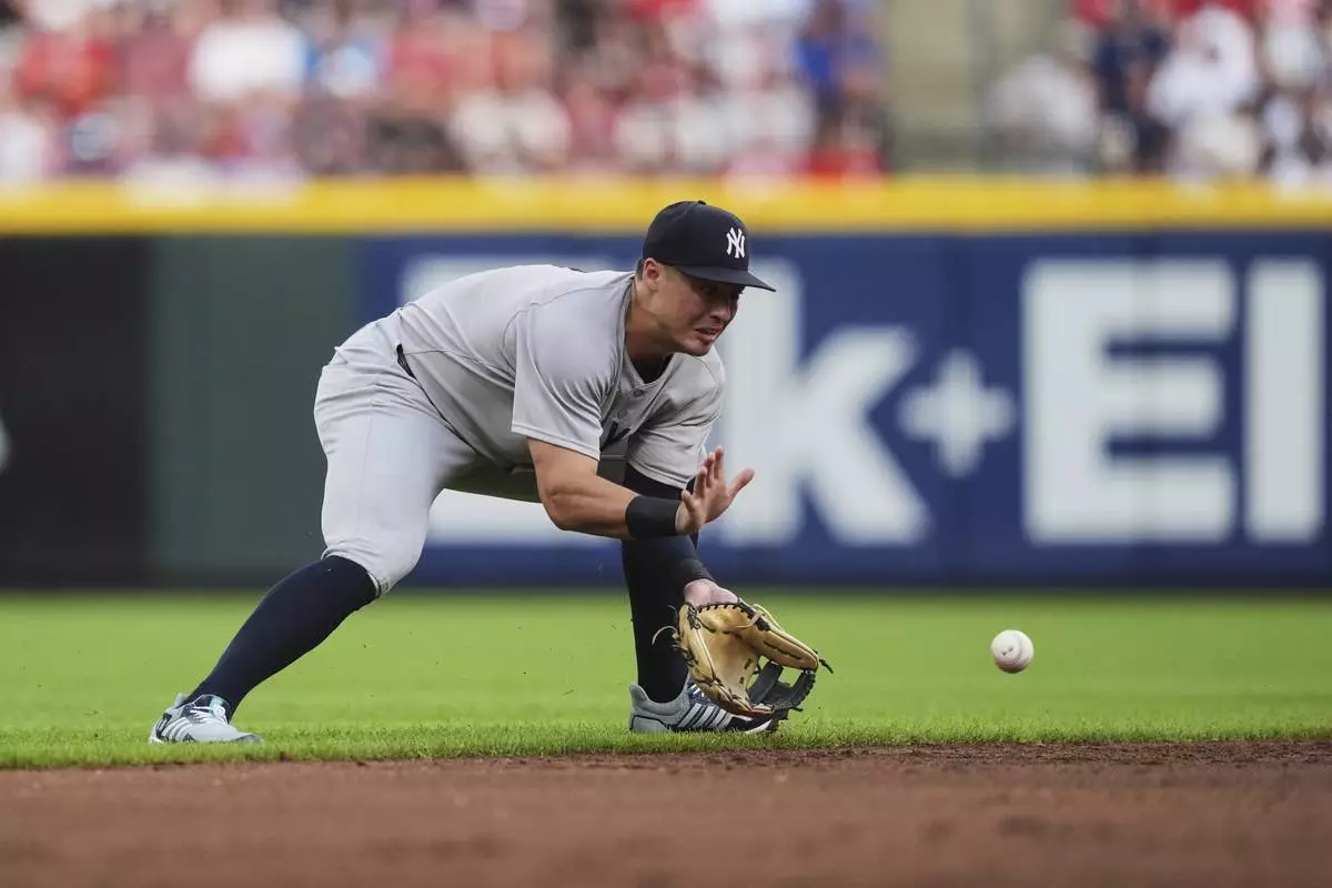 New York Yankees shortstop Anthony Volpe fields a ball hit by Cincinnati Reds' Jose Trevino during the second inning of a baseball game, Tuesday, June 24, 2025, in Cincinnati. (AP Photo/Joshua A. Bickel)