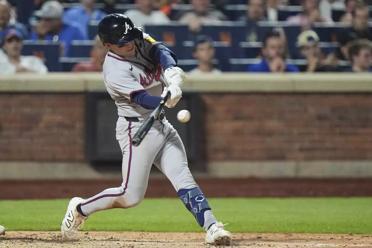 Atlanta Braves' Nick Allen hits an RBI single during the sixth inning of a baseball game against the New York Mets Tuesday, June 24, 2025, in New York. (AP Photo/Frank Franklin II)