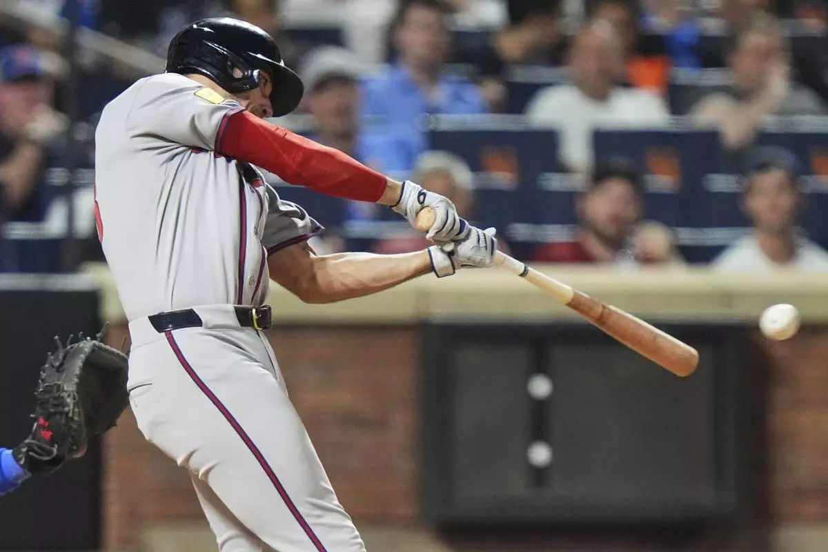 Atlanta Braves' Matt Olson hits a two-run single during the sixth inning of a baseball game against the New York Mets Tuesday, June 24, 2025, in New York. (AP Photo/Frank Franklin II)