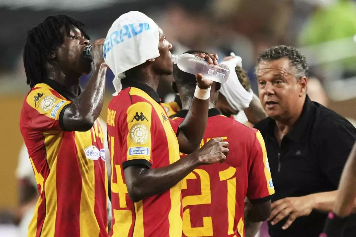 Esperance de Tunis players take a drink during a break in the Club World Cup Group D soccer match between Esperance Tunisie and Chelsea in Philadelphia, Tuesday, June 24, 2025. (AP Photo/Matt Slocum)